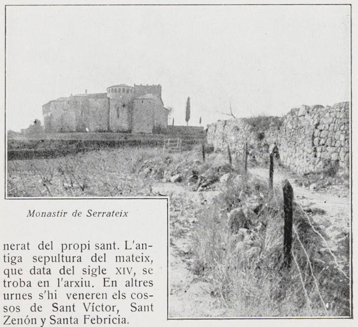 2 h. 30. Monastir de Serrateix. Avui la iglesia es temple parroquial y part de l’antic edifici està convertit en rectoria. Es un antic monument molt apreciable y digne d’esser visitat. El primitiu monastir, segons documents mencionats pel P. Villanueva en son Viaje literario a las Provincias de España, existia ja en l’any 940, regnant a França el rey Lluis l’Ultramarí, y estava dedicat a Santa Maria y a Sant Urbici. En el propi sigle X, en 997, el comte de Besalú Oliva Cabreta y’l bisbe Miró, son germà, ab el beneplàcit de Wisaldo II, bisbe d’Urgell, fundaren un monastir a Serrateix, baix les regles de Sant Benet y Sant Basili y l’advocació de Santa Maria y Sant Urbici o Urbà. Fou’l primer abat un monjo anomenat Froilà, tingut en santa opinió y que habitava ja aquests llocs per revelació divina. Al ferse la fundació fou donada al cenobi tota la serra del Teixó o sia Serra Teix.