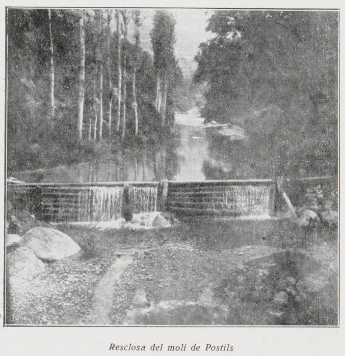 8 h. 55. Molí nou de Postils, bellament plaçat al peu de l’aigua; alta y rústega palanca a son enfront; bell ornament d’arbreda. Pel pas de la palanca va a trobarse’l camí que puja a la forta casa de Postils y a la iglesia de Tantellatge, en cosa d’una hora (Itin. n.° 50).