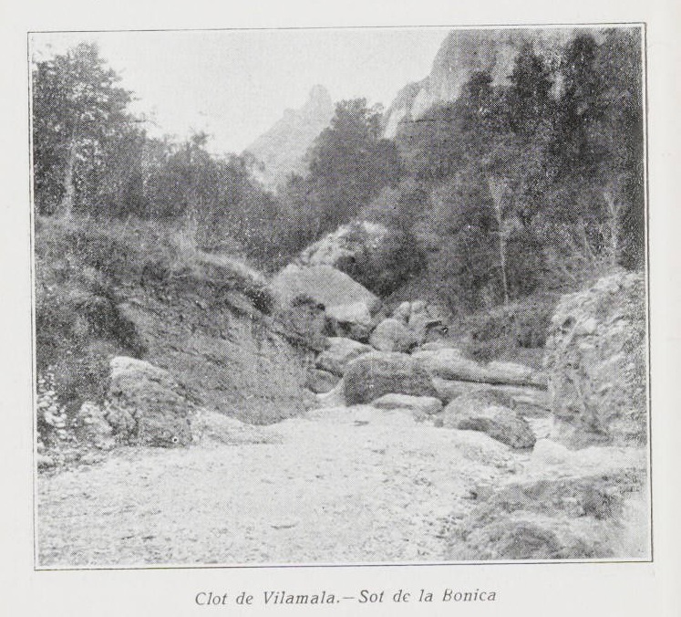 Deixant el camí el Pas del Diable al dessota, a l’esquerra, s’enfila de dretab ràpids revolts en amunt dels penyalars y per entre bonic bosc. S’enlaira aviat ab plé domini de vista sobre la clotada de Vallonga y sos solitaris y aspres envolts. La costa es dura y feixuga. Des de aquí el viarany es impracticable a les cavalleries.