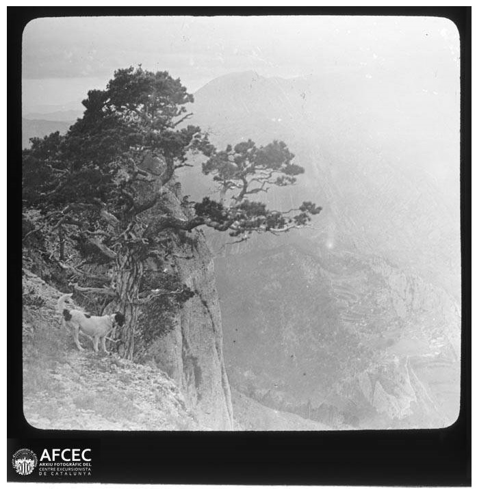 Un gos al costat d’un arbre en un cingle de la serra de Busa – ca 1907 – AFCEC Juli Vintró i Casallachs