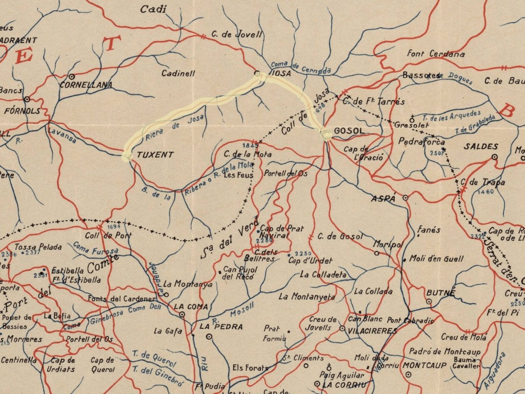 30 m. Coll de Josa —1690 m. alt,—obert entre’ls cingles de Costafreda y Castell de Termes y entre caients del Aiguadevalls y del riu Lavansa. Limit entre la Comarca del Cardener y l’Urgellet.