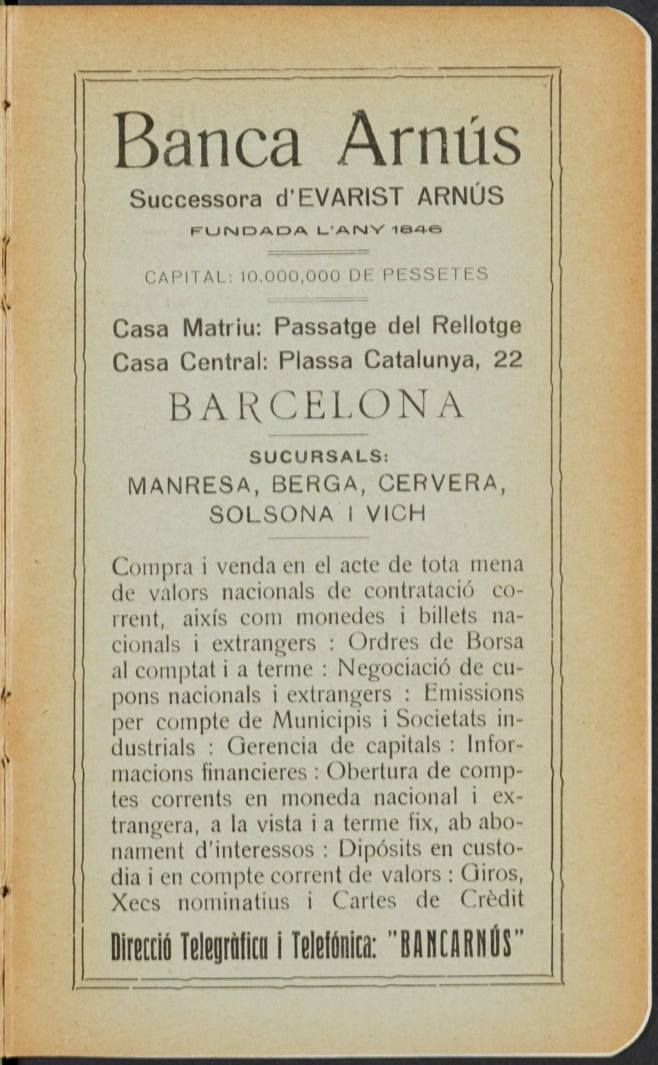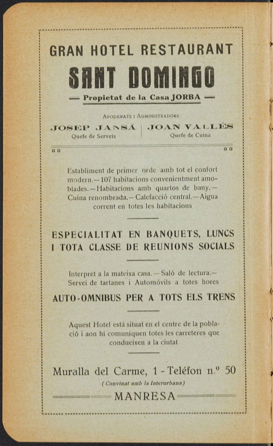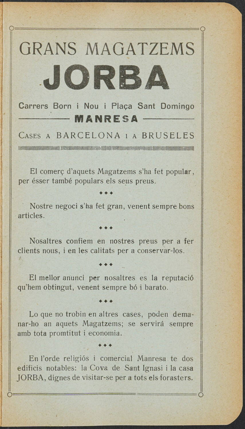 | Anuncis de la “Comarca del Cardener“, la guia “TORRAS, Cesar August (1922). Pirineu Català. Comarca del Cardener. Ed. Torras Hostench“, a les 8 primeres pàgines i a les 8 darreres pàgines. |