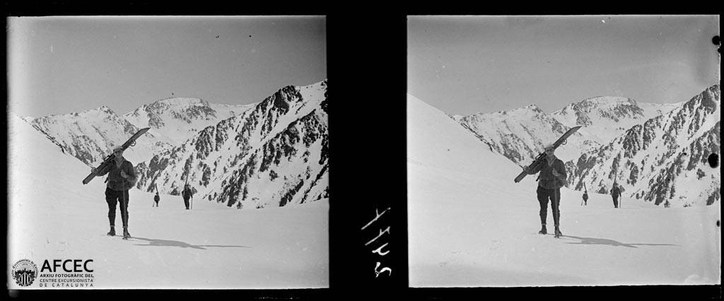 Alpinistes portant esquís a l’espatlla en un vessant nevat de la serra del Verd – Gósol – Entre 1915 i 1935 – AFCEC Lluís Estasen i Pla
