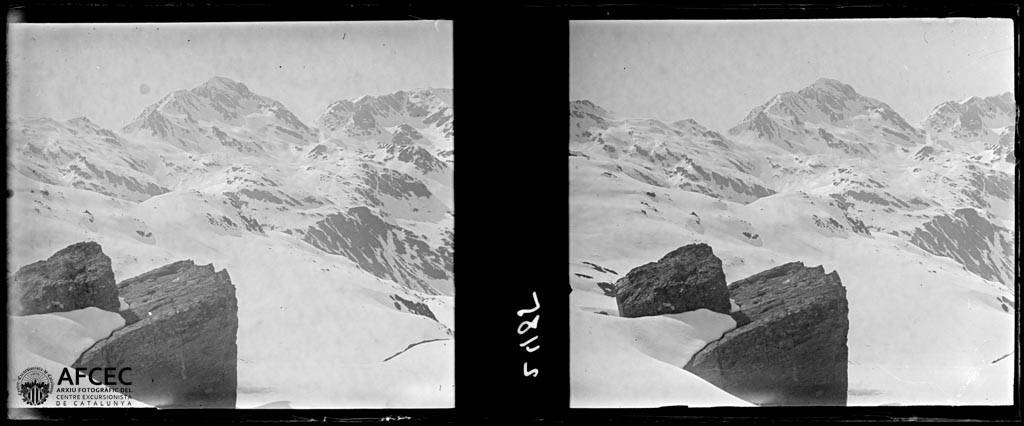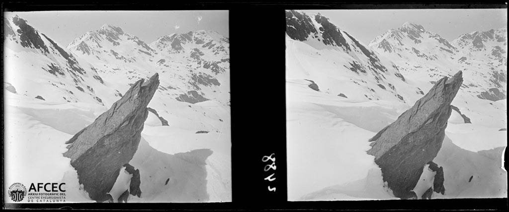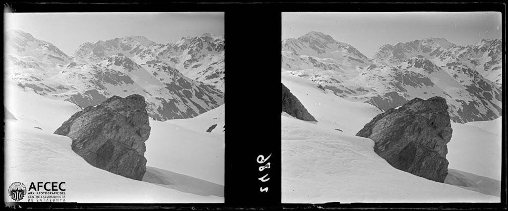 Cim nevat amb una roca en primer terme a la serra del Verd 2 – Gósol – Entre 1915 i 1935 – AFCEC Lluís Estasen i Pla
