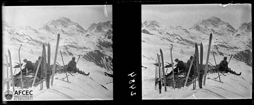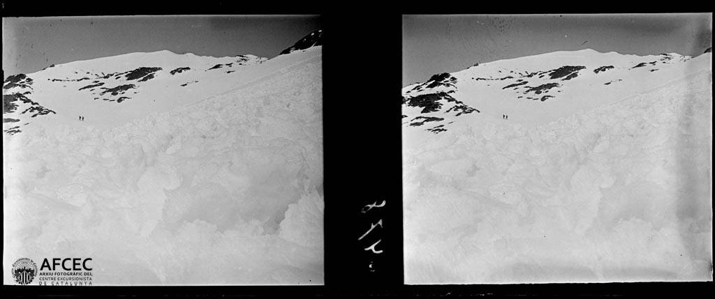 Vessant nevat d’una muntanya a la serra del Verd amb dos alpinistes – Gósol – Entre 1915 i 1935 – AFCEC Lluís Estasen i Pla