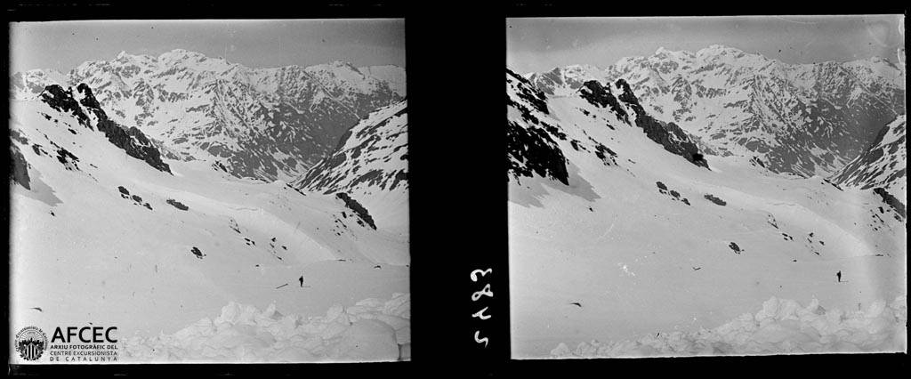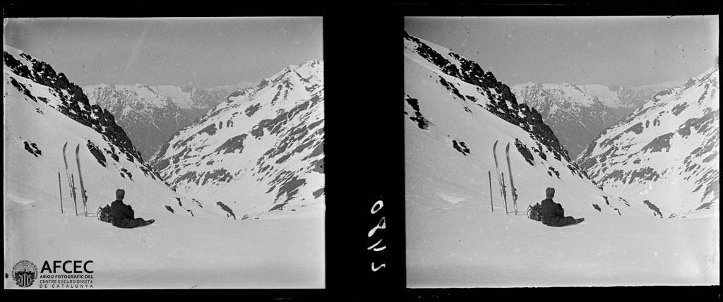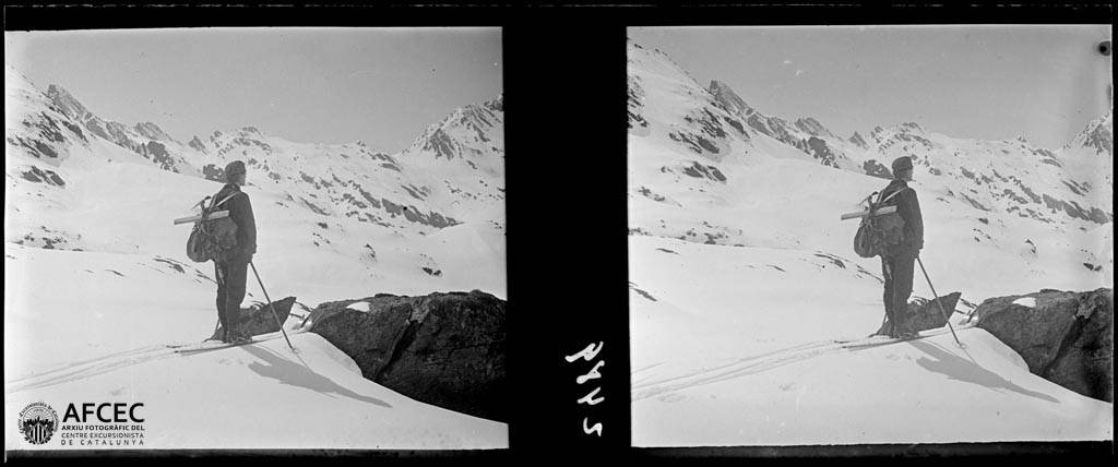 Un esquiador en un vessant nevat de la serra del Verd 1 – Gósol – Entre 1915 i 1935 – AFCEC Lluís Estasen i Pla