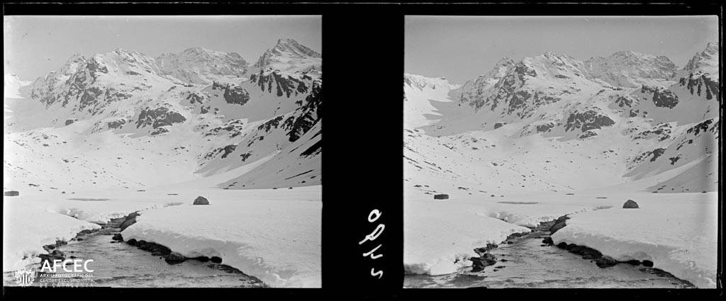 Riu en un pla nevat i al fons cims rocosos de la serra del Verd – Gósol – Entre 1915 i 1935 – AFCEC Lluís Estasen i Pla