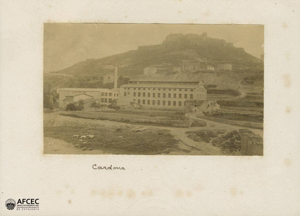 Fàbrica tèxtil La Plantada en primer terme i al fons el castell de Cardona – Entre 1900 i 1930 – AFCEC Autor desconegut