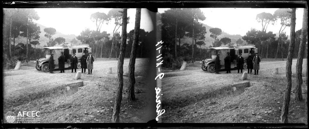 Grup de gent i un vehicle en un carretera voltada de bosc prop de Súria – 1917-12-09 – AFCEC Arnau Izard i Llonch