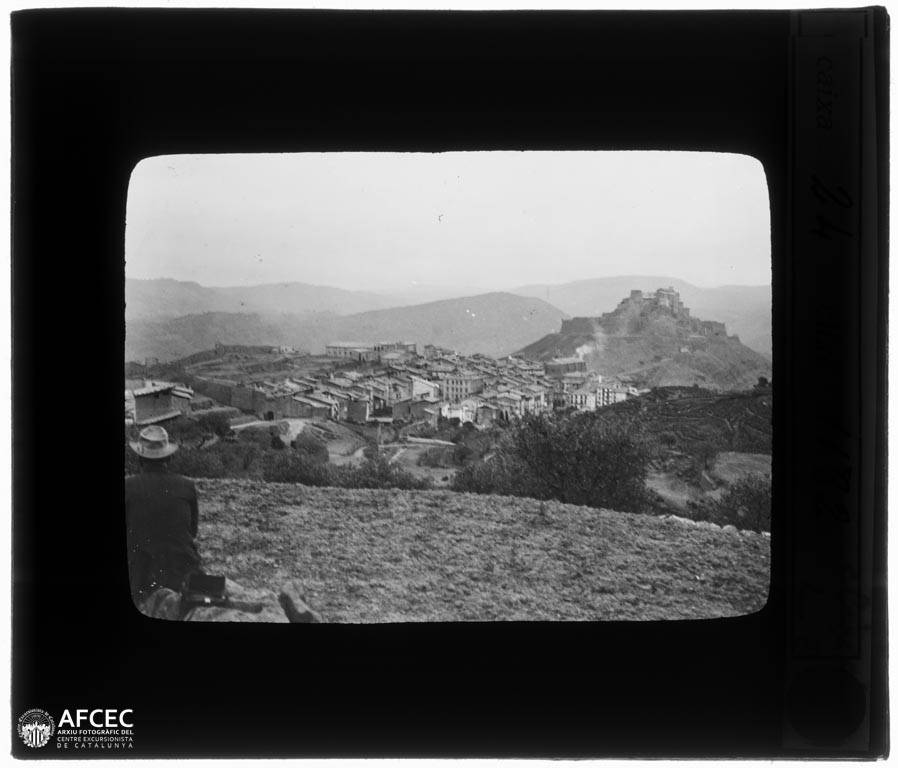Home assegut observant la ciutat de Cardona. Al fons, el castell – Entre 1890 i 1920 – AFCEC Autor desconegut