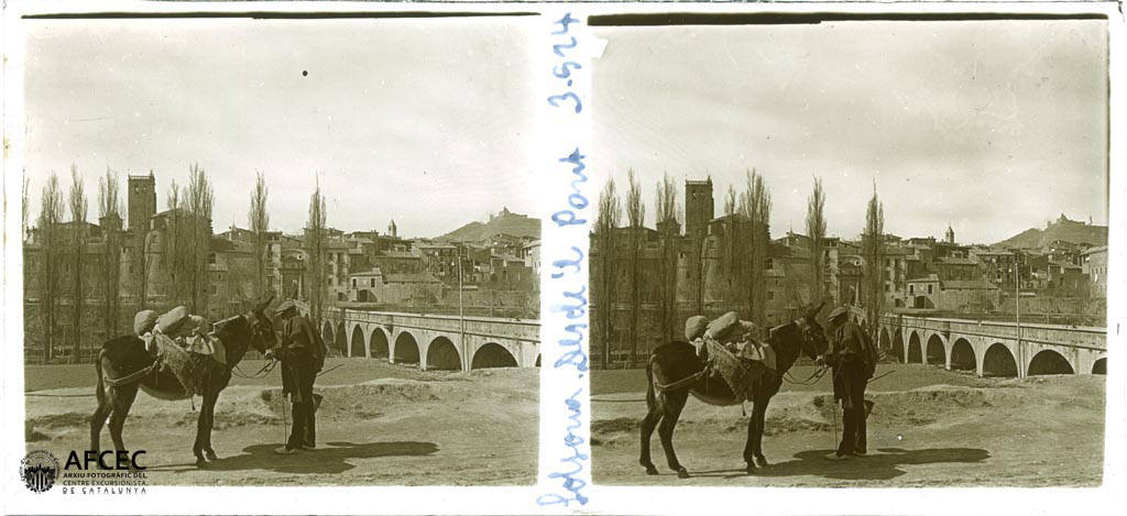 Traginer amb una mula carregada a la riba del riu Negre amb el pont i Solsona al fons – 1924-03 – AFCEC Francesc Blasi i Vallespinosa
