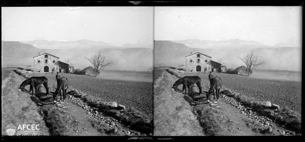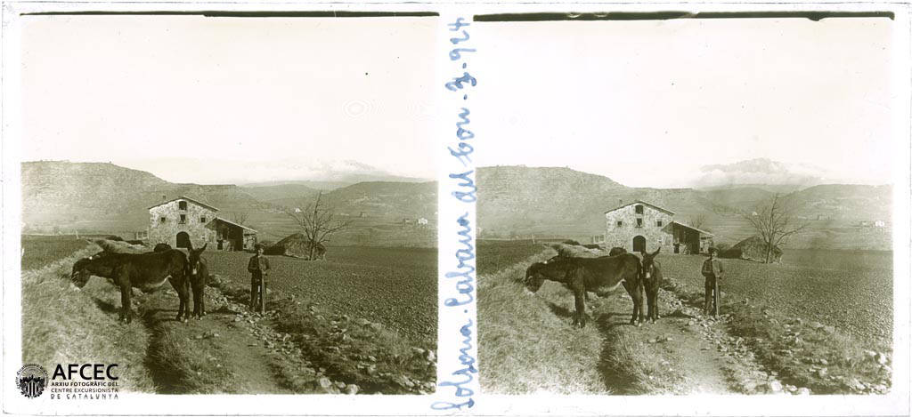 Un home amb dos ases vora la masia La Cabana del Ton del municipi de Solsona – 1924-03-22 – AFCEC Manuel Genovart i Boixet