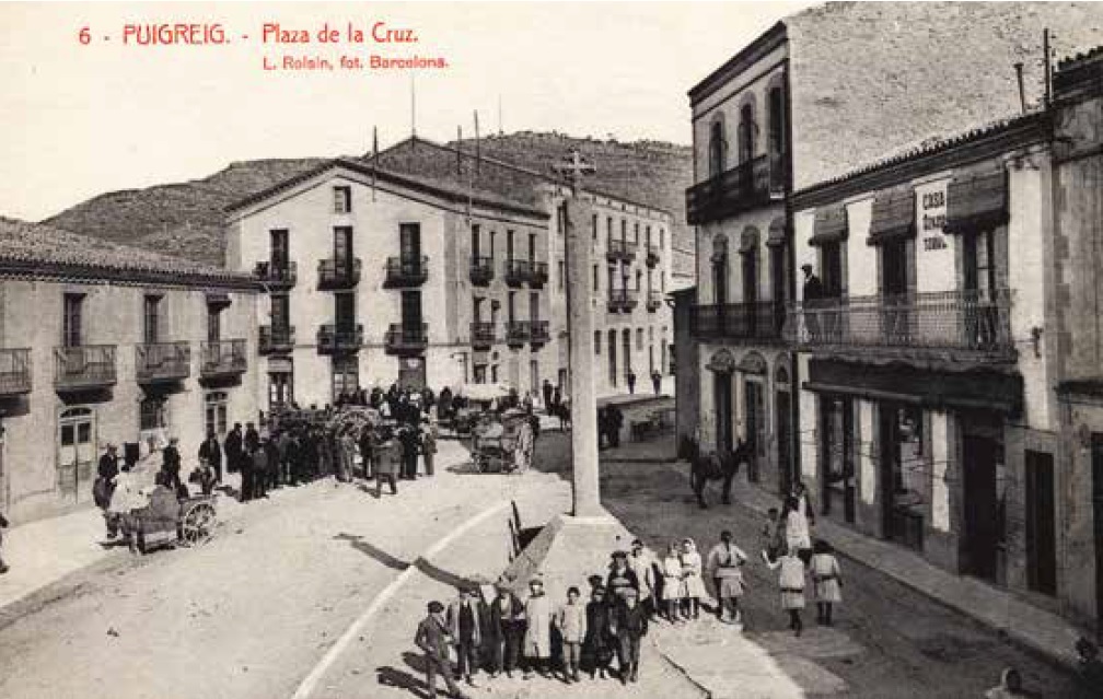 Plaça de Torà amb una creu de terme, diverses persones i carros – 1927 – AFCEC Carles Fargas i Bonell