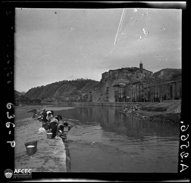 Dones rentant roba al riu Cardener el poble de Súria al fons – 1924-03 – AFCEC Francesc Blasi i Vallespinosa