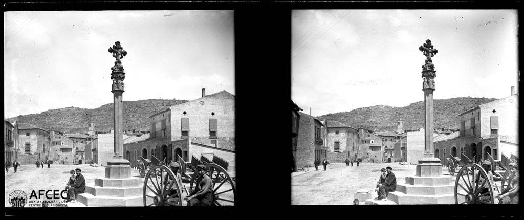 Plaça de Torà amb una creu de terme, diverses persones i carros – 1927 – AFCEC Carles Fargas i Bonell