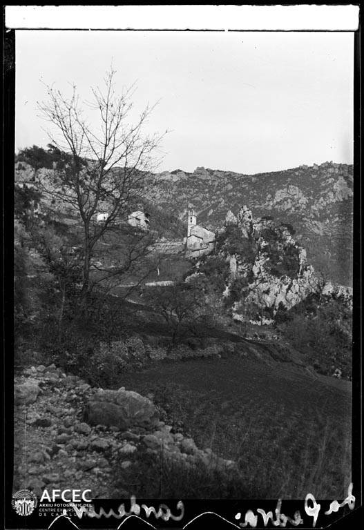 Restes del castell i església de Sant Julià de Coaner des de l’església de Santa Maria – Entre 1895 i 1916 – AFCEC Autor desconegut