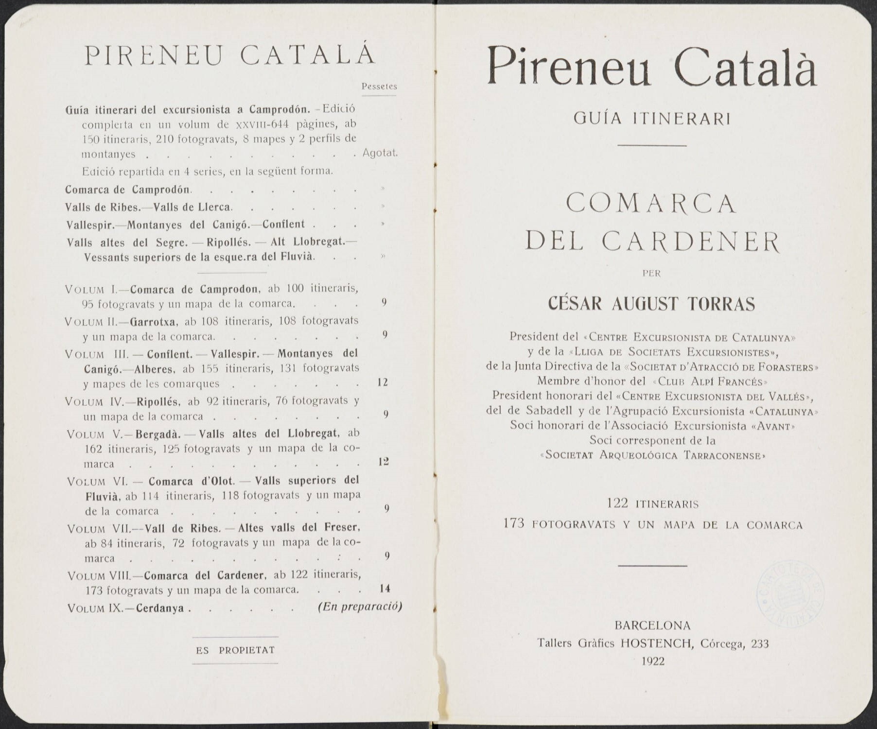 | Taula d’itineraris de la “Comarca del Cardener“, la guia de “TORRAS, Cesar August (1922). Pirineu Català. Comarca del Cardener. Ed. Torras Hostench“, després dels anuncis inicials i abans de la taula dels gravats. |